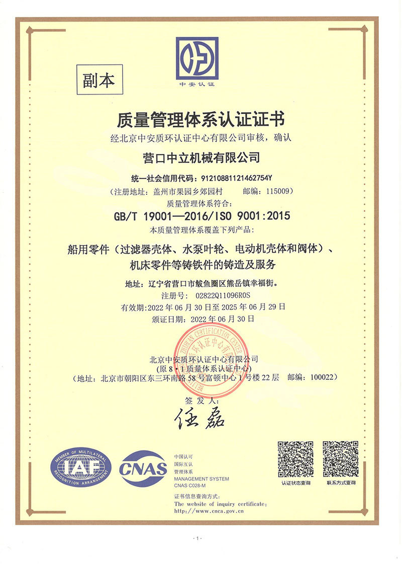 營口中立機(jī)械有限公司位于營口市鲅魚圈區(qū)熊岳鎮(zhèn)幸福街,成立于1982年,占地面積15000平方米,建筑面積10000平方米,是從事高性能鑄鐵件生產(chǎn)的專業(yè)廠家。年生產(chǎn)能力5000噸。鑄造采用電爐熔煉呋喃樹脂砂造型先進(jìn)工藝生產(chǎn),產(chǎn)品具有材質(zhì)性能高、形狀復(fù)雜、尺寸精度、表面美觀等特點。多年來產(chǎn)品主要出口日本、德國及英美等國家,產(chǎn)品種類有機(jī)床、電機(jī)、船用閥門水泵、工程機(jī)械等千余品種鑄件或加工配套產(chǎn)品。